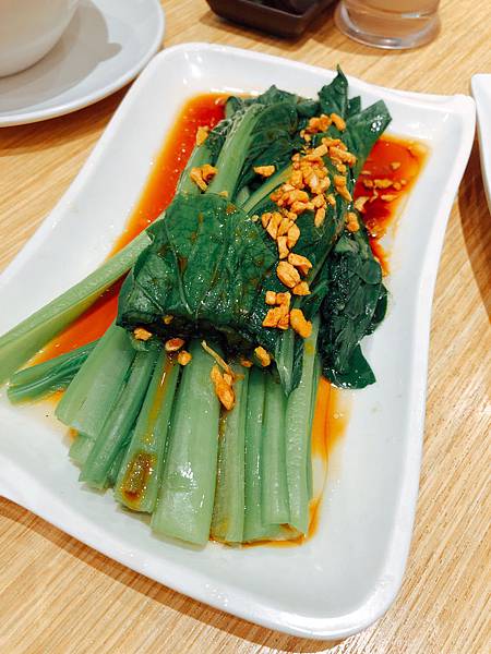 白灼時蔬:芥蘭菜,帶有微苦味,上面則是蒜酥,淋上醬油。