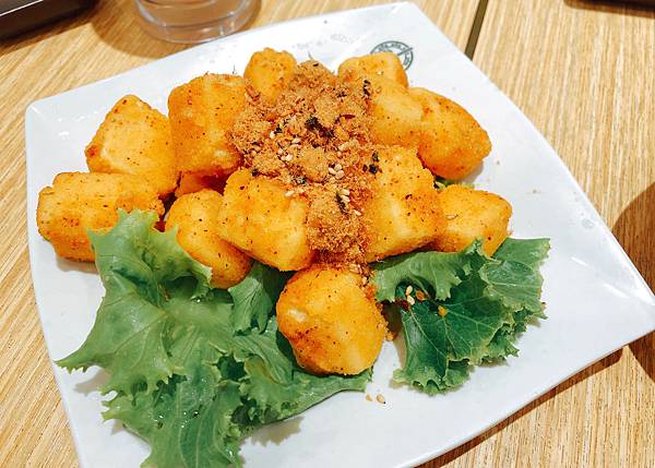 雞蛋豆腐裹粉炸,裡面超級軟嫩,筷子很容易一夾就破,老人們很喜歡,我也喜歡,上面的香鬆也好好吃。