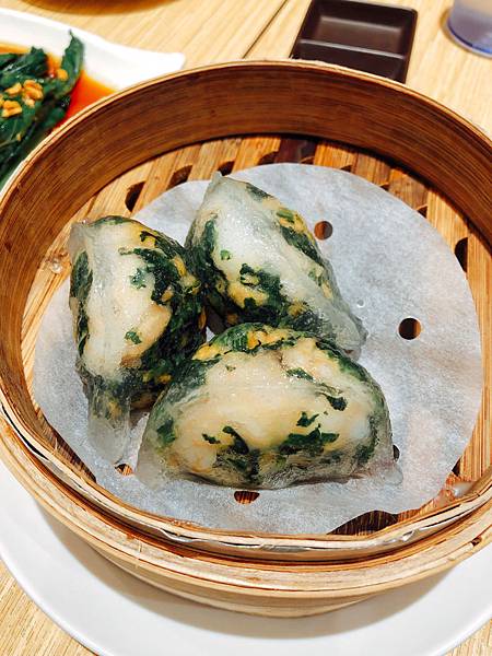 這道外觀不是很令人有食慾,實際吃也的確還好,外層吃來就像皮薄的水晶餃,裡面包的餡沒什麼菠菜味,調味也偏淡,搭配醬料食用比較好。